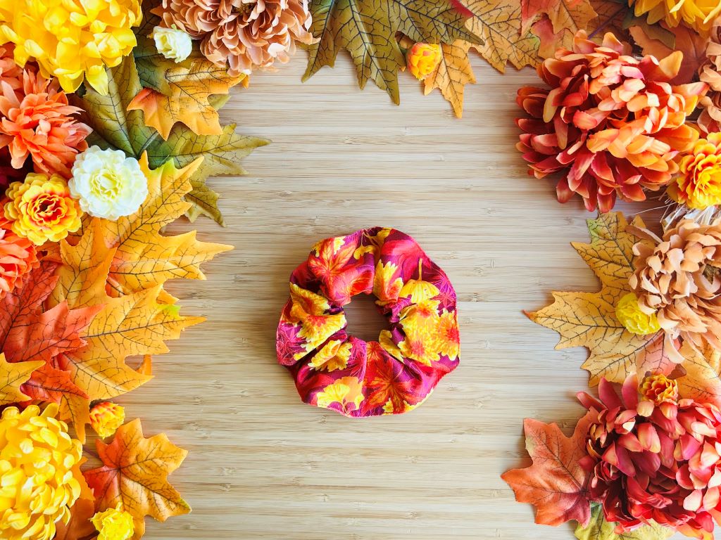 - elegant scrunchie fabric hair tie adorned with a reproduction of my acrylic paintings of chrysanthemums, maple leaves, ginkgo tree leaves, and spider lilies